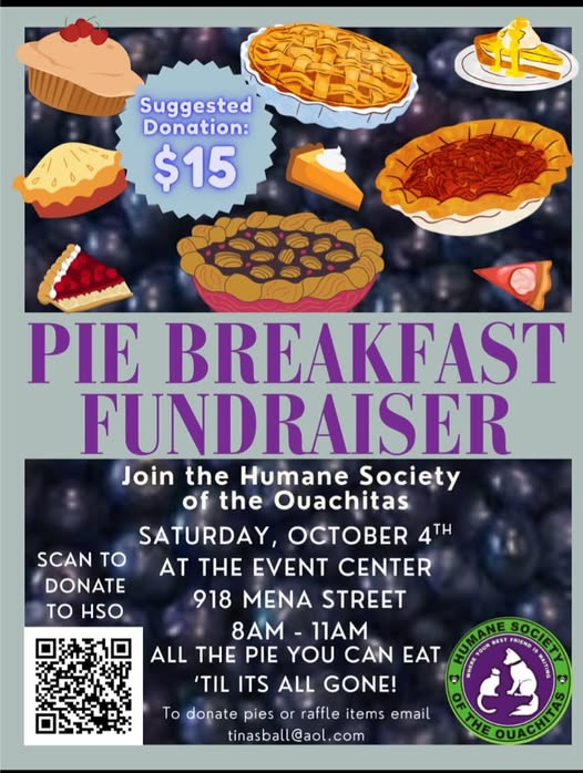 As a community service, we are pleased to share the Humane Society of the Ouachitas will be holding an all-you-can eat pie breakfast Saturday, Oct. 4. $15 suggested donation for pie? We'll be there!